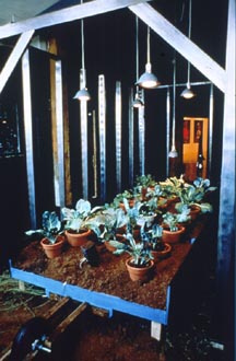 Johnny Coleman (b.1958 ) The raw and found materials incorporated in this piece tell a lot about Johnny Coleman's concerns and work. In this piece he sought to unearth the stories of the African-Americans that came north with the migrations and inhabited the neighborhoods. The interviews he had with several generations of black Clevelanders are recorded and used. The materials include rusted tin gathered from fallen roofs lining the walls, collard greens growing in clay pots set in an oversized wheelbarrow, dried flowers gathered from vacant lots, found wooden door and windows, treated tar-paper, found wooden chairs, found silk ties, and the voices of African American residents emerging from among the greens. In other words, the "stuff" of the city. Johnny teaches sculpture/interdisciplinary media at Oberlin College. |