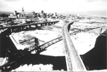 Abe Frajndlich (b.1946) Born in 1946 in Frankfurt, Germany. Immigrated to US in 1956 and resided in Cleveland until 1985. Currently lives and works in New York City. Well known in the regional art scene when he lived in Cleveland, Abe Frajndlich set out to capture many familiar sights of Cleveland in unfamiliar ways. In 1980 he photographed architectural landmarks by experimenting with infrared-sensitive film. This kind of film reacts to both heat and light, causing warm areas and green leaves to glow luminescently while reds are thrown into contrast. The infrared effect often makes the structures in Frajndlich's photographs give off a dreamy halo, as if they glowed from within. He printed the suite of 12 images as black and white gelatin silverprint photographs. The subjects range from this aerial view of Cleveland interstate highways converging on downtown and a view of the Noguchi sculpture at the Justice Center to the Cleveland Museum of Art fountain and homes hugging a Shaker Lake. The results reflect familiar architectural elements of the city in a lively different light. |