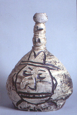 Kirk Mangus (b 1952) Mangus works have been described as borrowing the sensibility of early Asian ceramics and volumes from the classic Greek vases. The carvings are multi layered and contemporary giving them an irreverent and insolent. After carefully selecting the clay that is critical because of the surface needed to achieve his results, the artist used a wood-fired kiln which he built into the side of a hill on his parent's farm in western Pennsylvania where he can get just the result he wants. The artist can control the effects by monitoring the length of firing and the arrangement within the kiln. He cannot control the unpredictability of the Raku glaze. Big Bug Jar is a basic jar form, wheel thrown and reaching 29” where the artist carves deeply enough to perferate the vessel wall in several places which becomes part of the design. The vibrant calligraphic lines are grouped rhythmically. Kirk Mangus teaches at Kent . His work has been His work has been shown in solo and group exhibits in this region and throughout the United States including the Seattle Art Museum and the Renwick Gallery, Washington, D.C. |